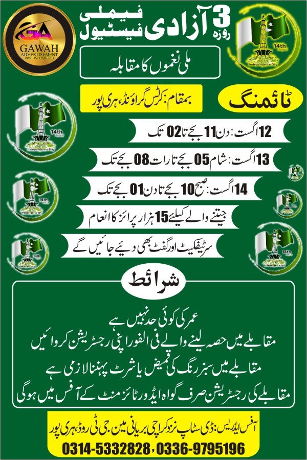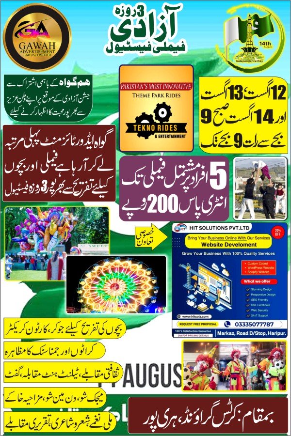 August 14, 2024, is a special day for Pakistan, marking Independence Day with grandeur and unity. This year, the Curtis Ground in Haripur is hosting a vibrant 3-day Azadi Family Festival. From August 12th to 13th, families from across the region will gather to enjoy a festival filled with entertainment, creativity, and national pride. The event promises to create lasting memories, especially for children.