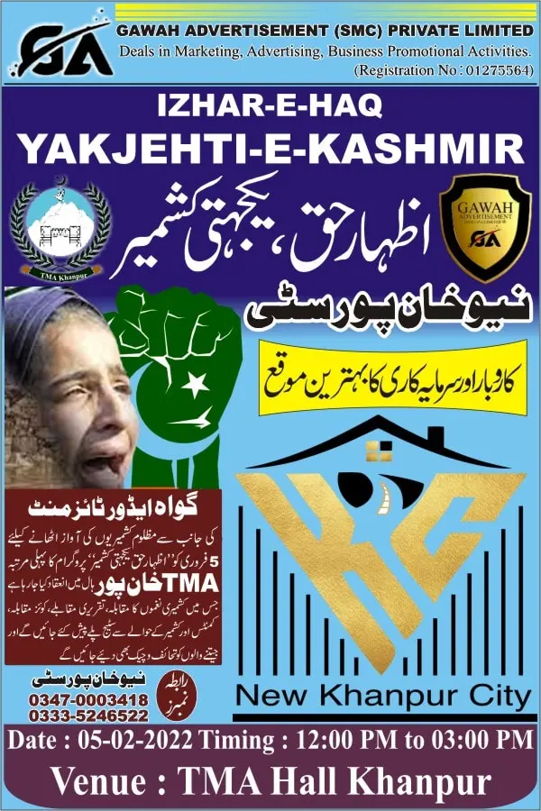 On February 5, 2022, Khanpur, Pakistan, held a significant event titled “Izhar-e-Yakjehti-e-Kashmir” to show solidarity with the people of Kashmir. This event was part of the annual Kashmir Solidarity Day observed in Pakistan. The day is dedicated to expressing support for Kashmiris and drawing attention to their ongoing struggle for self-determination.